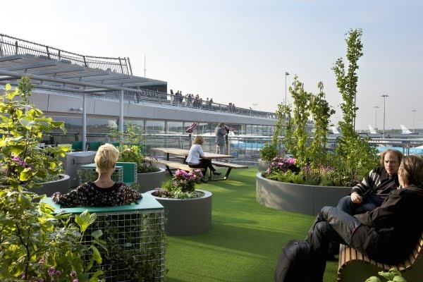 Aeroportul Schipol din Amsterdam a primit un nou "look" mai verde la unul din terminale. Trecerea de la peisajul urban la cel înverzit este anunţată de un copac în vârstă de 130 de ani şi care a fost adus aici pentru a fi salvat, după ce habitatul său natural a fost distrus. Printr-o tehnică numită "mixed reality" oamenii se pot bucura de proiecţii cu fluturi, sunete de animale şi păsări care crează o atmosferă asemănătoare celei dintr-un parc. Airport Park îşi propune să reflecte pacea şi seninătatea parcurilor de oraş în mijlocul agitaţiei cotidiene.Pentru că este un proiect eco, autorităţile au pus la dispoziţie biciclete care prin pedalare produc energie electrică cu care pasagerii îşi pot încărca telefoanele mobile.În concordanţă magazinele oferă produse bio, iar întreg terminalul este iluminat cu ajutorul led-urilor.